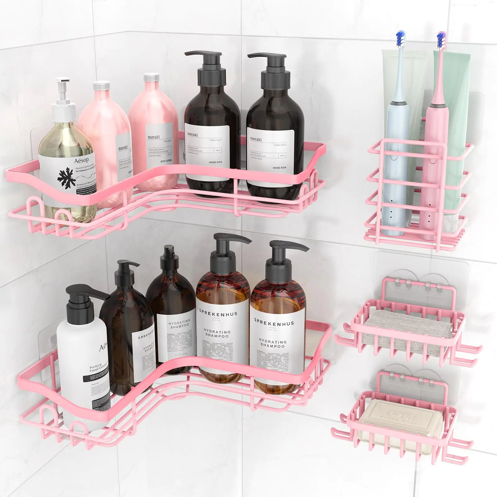 [L-Shaped Design: Hsiohe Corner shower shelves set comes with 2 corner shower shelves 2 soap holders and 1 toothbrush holder. This L-Shape of the corner shower caddy is designed for making full use of corner space. Large capacity shower organizer can easily store washing supplies or cooking seasonings make full use of the space and facilitate life. "DURABLE MATERIAL: Hsiohe bathroom organizer is made of stainless steel which is waterproof rust-proof and scratch-resistant. The hollow design at the bottom can help drain water quickly and keep dry avoiding harmful substances in the wet environment. Its an ideal addition to your bathroom." STRONG ADHESION & SUITABLE FOR ALL SMOOTH WALLS: The upgraded version of the transparent non-marking adhesive provides you with stronger stability. The load-bearing capacity can reach up to 40lbs. You can install it on any smooth wall so you can buy it without worrying about not being applicable. NO DRILLING & EASY INSTALLATION: Hsiohe shower organizers can be easily installed in minutes without drilling or any tools. Clean the surface stick the adhesive to the wall. Note: This shower caddy fits 90 degrees wall corner not suitable for rounded or irregular corner space. EFFICIENT STORAGE TOOL: Are you tired of the messy bathroom? Shower shelf will make your bathroom more clean and tidy. It is widely used in kitchen or bathroom perfect for keeping bathroom or kitchen items organized. This bathroom shower organizer is an ideal gift for your family. Any questions please feel free to contact us we will provide better solutions for every dear customer!]